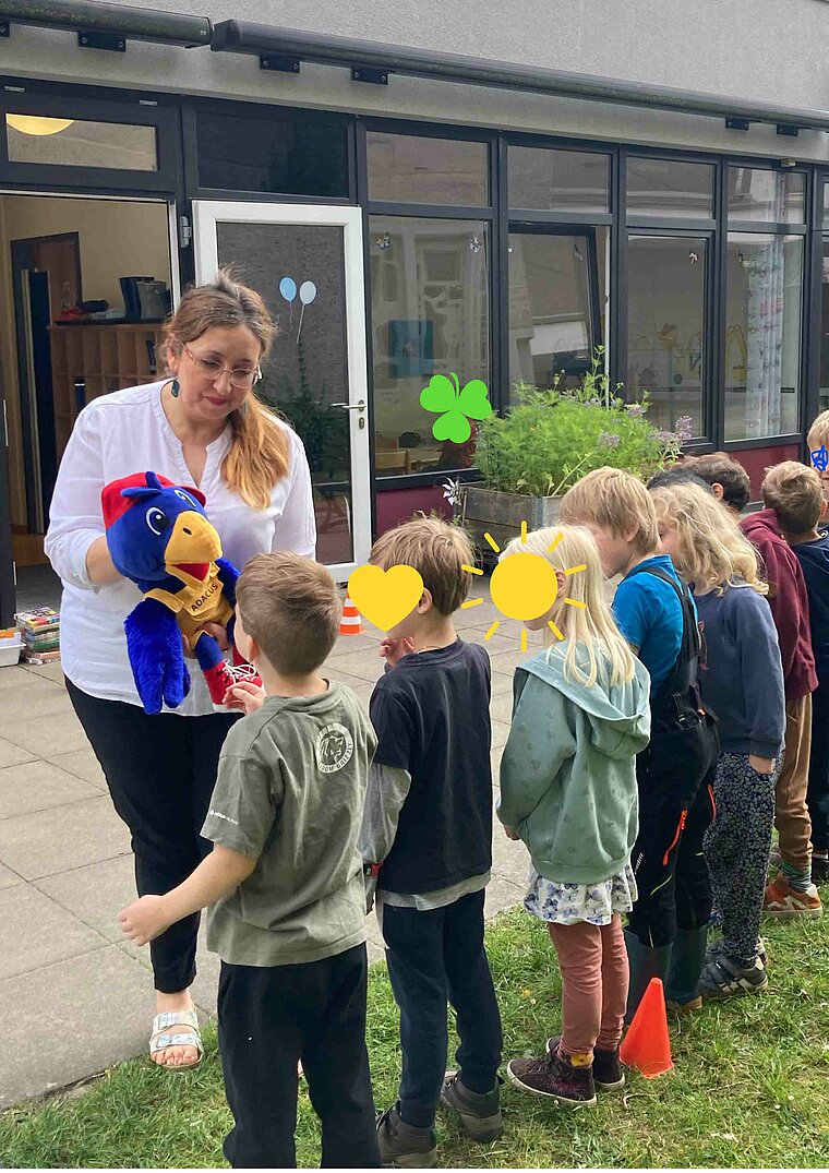 In der Kita St. Elisabeth in Hastedt haben Erzieherinnen am Mittwoch mit den angehenden Schulkindern geübt, wie man richtig über die Straße geht – und worauf die Mädchen und Jungen an der Fußgängerampel und am Zebrastreifen achten müssen. Unterstützten war beim Gespräch über die Verkehrsregeln die Raben-Handpuppe Adacus.