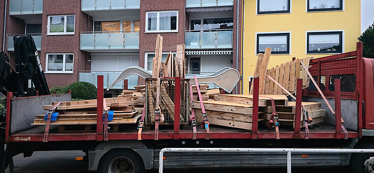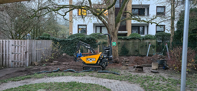 Die Garten- und Landschaftsbauer haben bereits mit einem kleinen Bagger angefangen, alles vorzubereiten, die Firma „Ghepetto“ hat Spielgeräte aus Holz und eine Rutsche angeliefert und mit dem Aufbau begonnen. Geplant ist, das Baumhaus in der nächsten Woche nach der offiziellen Abnahme für die Kinder zu eröffnen.
