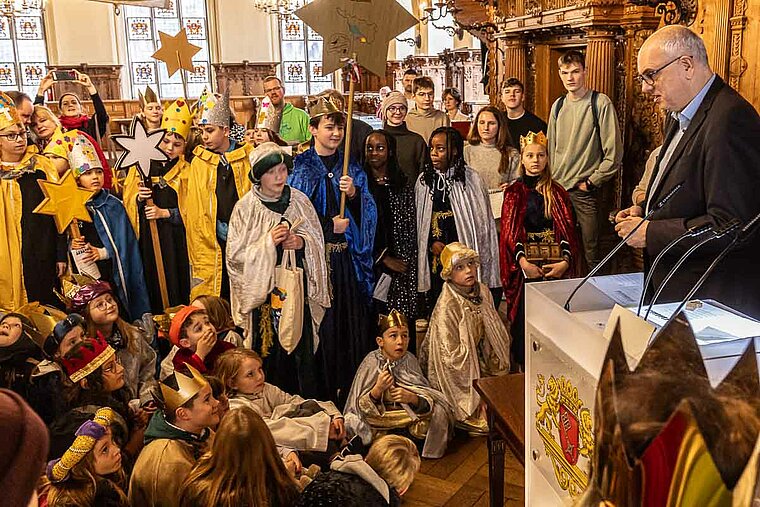 Hoher Besuch im Bremer Rathaus: Bürgermeister Andreas Bovenschulte hat am Montag rund 55 als Heilige Drei Könige verkleidete Kinder aus der Stadt Bremen empfangen. Er bezeichnete den Besuch der Sternsinger als „eine der schönsten Veranstaltungen“ in der Oberen Rathaushalle und lobte, dass die Kinder nicht nur an sich denken.