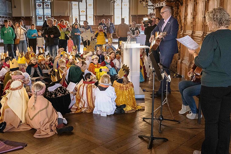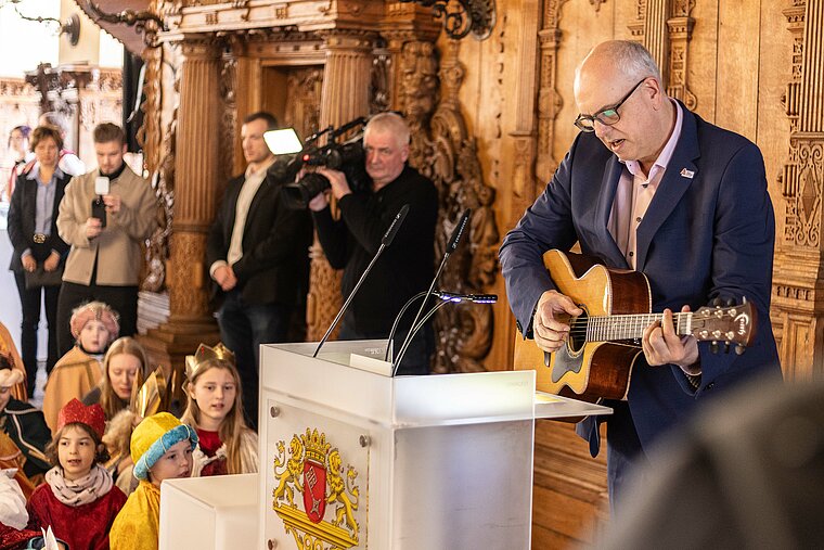 In der Oberen Rathaushalle griff Bovenschulte selbst zur Gitarre und sprach dann über die Aktion der Sternsinger, die in diesem Jahr unter Motto „Schule statt Fabrik – Sternsingen gegen Kinderarbeit“ steht. Er erinnerte daran, dass Kinderarbeit in früheren Jahrhunderten auch in Deutschland traurige Realität war und betonte, das er den Kampf dagegen für eine „ganz, ganz wichtige Aufgabe“ hält.