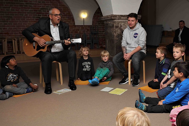 Mit einem gesungenen „Guten Morgen, schön dich hier zu sehen“ begrüßte ihn die Gruppe im Musikkeller. „Ihr könnt ja richtig toll singen“, lobte der Bürgermeister die Kinder, die mit ihrem Erzieher Lennart Michel und Erzieherin Karin Gercke in der Runde saßen. Die „Moorhexe“, „Auf der Mauer, auf der Lauer“ und „Anne, Kaffeekanne“ gehörten zum Repertoire des Politikers; Lieder, die er seinen beiden Kindern vor gut 15, 20 Jahren selbst vorgesungen hat.