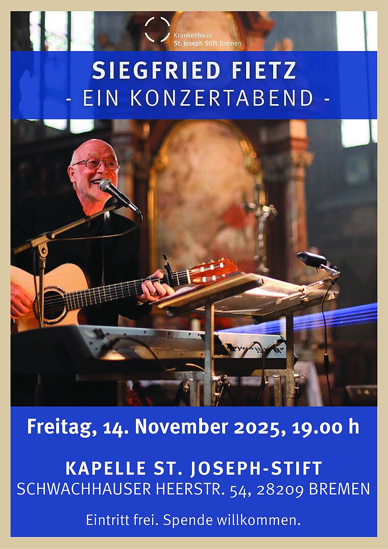 Die Krankenhausseelsorge im St. Joseph-Stift lädt ein zu einem Konzert mit dem Liedermacher Siegfried Fietz und seinem Sohn Oliver. Es wird veranstaltet am Freitag, 14. November ab 19 Uhr in der Kapelle des St. Joseph-Stifts, Schwachhauser Heerstraße 54. Der Eintritt ist frei; zur Kostendeckung wird um eine Spende gebeten.
