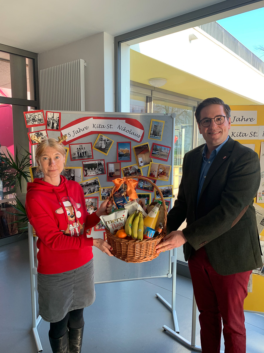 Nun hat Christopher Peiler, Geschäftsführer des Katholischen Gemeindeverbandes in Bremen, der Leiterin Christa Sommer zum Jubiläum einen Präsentkorb mit Lebensmitteln und Getränken überreicht.