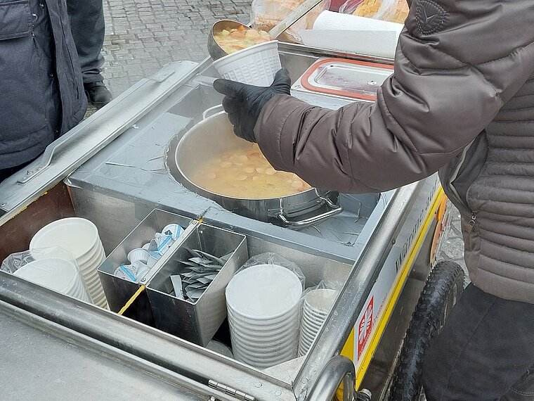 Das Projekt Wärme auf Rädern gibt es seit mehr als 20 Jahren. Montags und donnerstags ziehen je zwei Ehrenamtliche vor den Bahnhofsplatz und verteilen Eintopf, Brot, Kaffee und Gebäck. Die Suppe wird in der Küche des St. Joseph-Stifts zubereitet. Finanziert wird sie aus Spenden