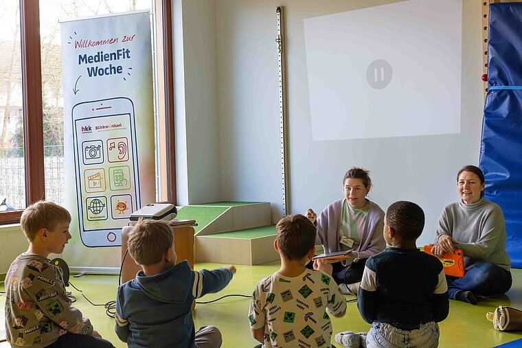 Zur „MedienFit-Woche“ gehören auch eine Fortbildung für die pädagogischen Fachkräfte der Kita und ein Eltern-Kind-Nachmittag. Dort erfahren die Erwachsenen unter anderem, dass es spezielle Kindersuchmaschinen gibt und dass der Elternratgeber flimmo.de besser ist als die Empfehlungen der Freiwilligen Selbstkontrolle (FSK). Sie erfahren auch, dass sie mit der eigenen Handy-Nutzung Vorbilder für ihre Kinder sind.